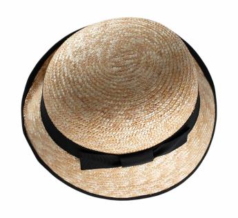 Handgefertigt aus genähtem Stroh, das Flechtwerk aus Stroh wird mit einem Drehteller Krempe an Krempe gewickelt und genäht.