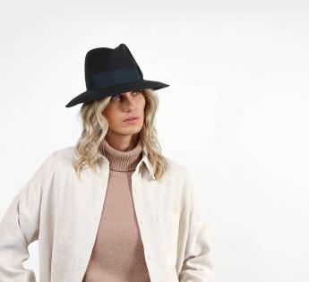 Die berühmte Prestigemarke wählte für diese Kreation den Fedora aus hochwertigem Filz. Das Modell ist dank eines Designs von hoher Qualität, elegant und schick, bequem. Der ikonische Hut ist hier mit einem einfachen Satin-Grosgrain verziert, das den Namen seines Schöpfers in goldener Schrift trägt. Er kann allein unseren Look veredeln.