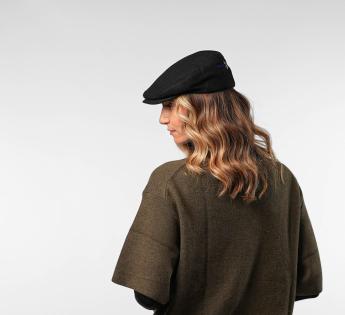 Flat cap neu interpretiert mit einem künstlerischen und zeitgenössischen Touch. Auf der Rückseite schafft eine abstrakte Stickerei in lebendigen Farben, die in unserem Atelier entworfen und gefertigt wurde, einen auffälligen Kontrast von Formen und Materialien.