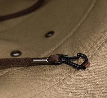 Hinter seiner Abenteurer-Ästhetik verbirgt dieser Baumwollhut eine beeindruckende Funktionalität. Das dichte Gewebe bietet optimalen Sonnenschutz, die belüfteten Ösen regulieren die Wärme und der abnehmbare Kinnriemen sorgt für sicheren Halt bei Wind.