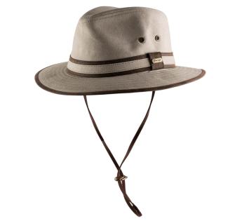 Hinter seiner Abenteurer-Ästhetik verbirgt dieser Baumwollhut eine beeindruckende Funktionalität. Das dichte Gewebe bietet optimalen Sonnenschutz, die belüfteten Ösen regulieren die Wärme und der abnehmbare Kinnriemen sorgt für sicheren Halt bei Wind.