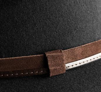 Chapeau traveller aus hochwertigem Filz, das sich insbesondere durch seine Flexibilität und die Weichheit seiner Haptik auszeichnet. Das Modell ist mit einem Wildleder-Effekt durch die Verzierung aus Leder seines bi-materiellen Galons dekoriert. Es wird in einer dezenten Farbe präsentiert, die perfekt für die Saison ist.