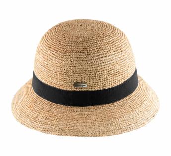 Sommerhut aus Raphia und Häkelarbeit. Sein durchdachtes Design macht ihn wandelbar in eine Glocke oder einen Bowler, was mehrere Stiloptionen bietet. Seine runde Kopfhöhe in schöner Höhe ist von einem marineblauen Galon umgeben, was ihn zu einem einfachen und lässigen Accessoire macht.