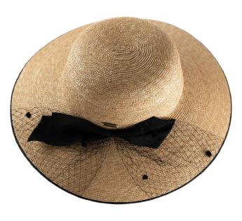 Dieser Hut vereint den ganzen Charme femininer Silhouetten. Seine weite Linie, das fein geflochtene Stroh, das gebundene Band und der leichte Schleier ergeben eine chice Ausstrahlung, zart vintage, voller Anmut und Charakter.
