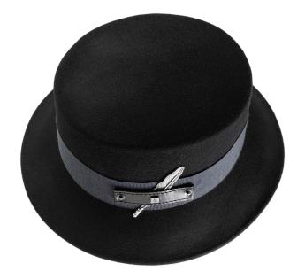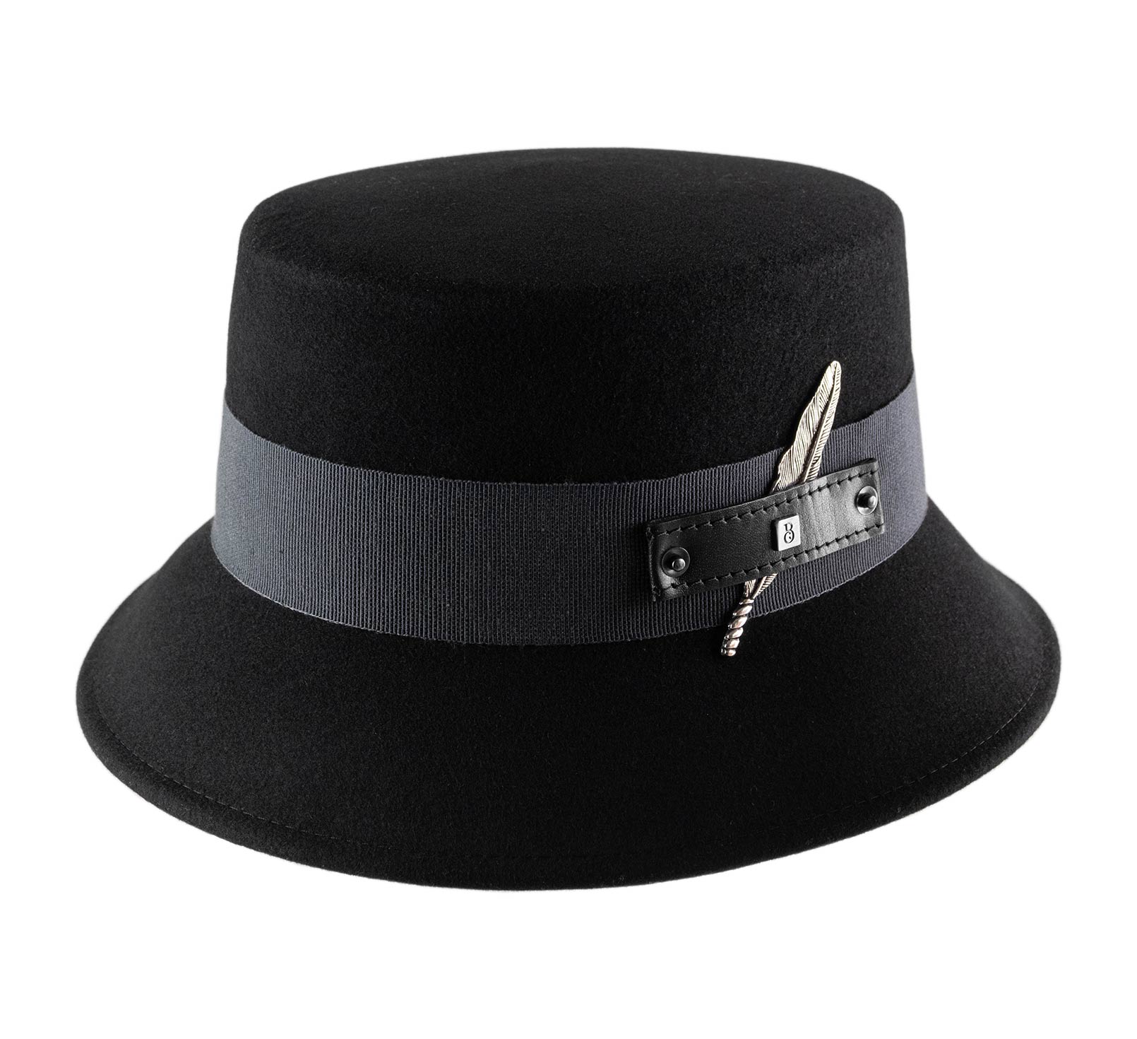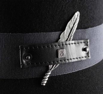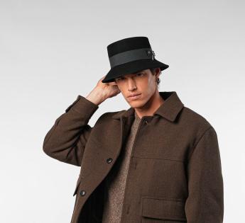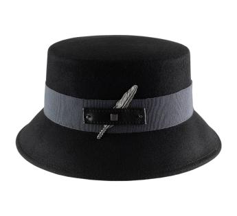 Kühn und strukturiert, verführt dieser Wollfilz-Fischerhüte mit seiner zeitgenössischen Ausstrahlung. Er ist mit einem breiten Grosgrain-Galon verziert, der mit einer metallischen Verzierung in Form einer Feder geschmückt ist, die auf einer gesteppten Lederlasche befestigt ist.