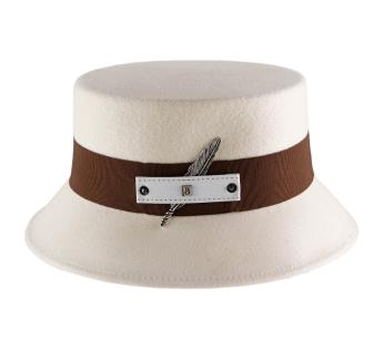 Kühn und strukturiert, verführt dieser Wollfilz-Fischerhüte mit seiner zeitgenössischen Ausstrahlung. Er ist mit einem breiten Grosgrain-Galon verziert, der mit einer metallischen Verzierung in Form einer Feder geschmückt ist, die auf einer gesteppten Lederlasche befestigt ist.