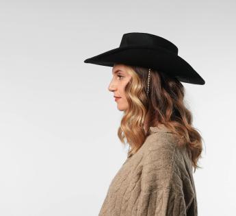 Dieser Westernhut besticht durch die Freiheit, die er seinem Träger bietet. Seine breite Krempe, vollständig mit Messing eingefasst, kann nach Belieben geformt werden: hochgeklappt für einen ausgeprägten Cowboy-Geist, leicht gebogen für einen dezenteren Stil oder gerade gelassen für einen zeitgenössischen Look. Ein wahres stilistisches Spielfeld.