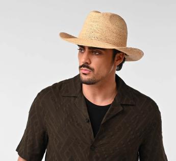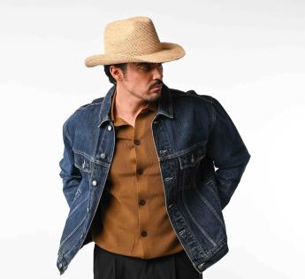 Ohne Verzierung setzt dieser Hut auf Schlichtheit und lässt so die Schönheit des Materials voll zur Geltung kommen. Seine natürliche Textur entfaltet sich in einem rohen Charme, leuchtend und ganz im Zeichen des Sommers.