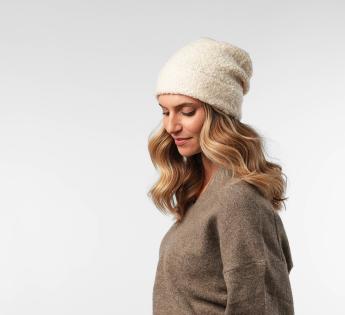 Wärme und umhüllende Weichheit für diese Mütze mit Bouclé-Textur und modernem Look. Ihr flauschiges Material mit plüschiger Haptik bietet hervorragende Isolierung und bleibt dabei atmungsaktiv, ideal für kalte Tage. Ihr flexibler Schnitt mit integriertem Revers passt sich bequem allen Formen an, ohne einzuengen.