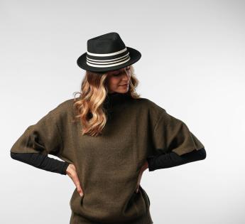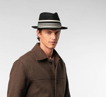 Perfekte Balance zwischen Schlichtheit und Kühnheit, dieser Fedora-Hut mit mittellanger Krempe besticht durch seine dezente Form, die sich leicht im Alltag tragen lässt. Aus leichtem, aber warmem Filz gefertigt, wird er durch einen ultra-grafischen Galon aufgewertet, der strukturiertes Strick, glatten Satin und kontrastierende Endet kombiniert.