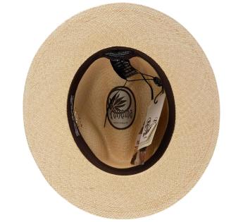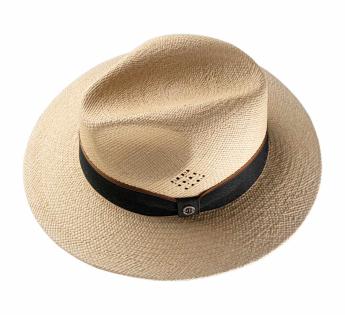 Dieser hut besticht durch seine schlichte, gepflegte Linie und offenbart seine Einzigartigkeit in einem durchbrochenen Muster, das wie feine Spitze in die Fasern der Panamahüte gezeichnet ist. Ein kostbares Detail, fast wie ein Schmuckstück, das das Licht einfängt und den Look vollendet.