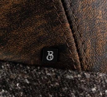 Flatcap aus Leder, verziert mit melierter Wolle. Mit ihrem robusten Aussehen bietet sie einen schönen, warmen und gemütlichen Kokon unter der Kopfhöhe, um den Kopf vor der Kälte zu schützen. Sie hat einen lässigen Stil mit einem deutlich retro Look. Sie kann auf verschiedene Arten kombiniert werden.