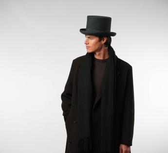 Dieser Zylinder aus gehärtetem Wollfilz verkörpert Eleganz in ihrer reinsten Form. Seine bewusst betonte hohe Kopfhöhe schafft eine majestätische vertikale Linie, die Unterschrift großer Zeremoniensilhouetten. Der steife Filz, präzise gearbeitet, sorgt für einen tadellosen Halt und eine raffinierte Verarbeitung.