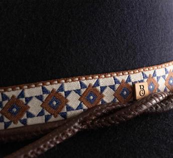 Sein Jacquard-Galon mit bunten geometrischen Mustern erinnert an die Codes des "weisen Western"-Stils, veredelt durch ein Lederband mit Metallspitzen. Das dezente Label zeichnet unser handwerkliches Können aus. Ein Detail, das den Unterschied macht. Ein Accessoire für Liebhaber von Authentizität, schönen endet und langlebigen Stücken.