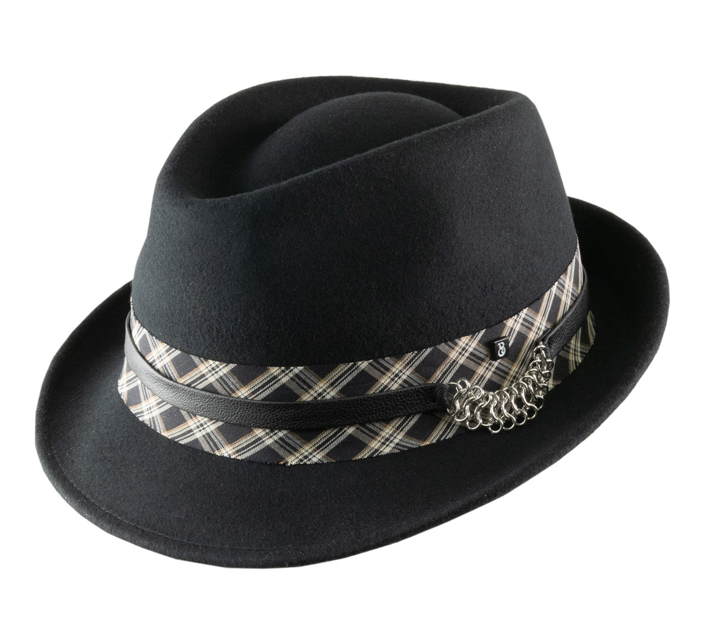 Trendspiel mit Materialien für diesen Trilbyhüte. Frisch im Stil und warm in der Abdeckung, ist sein Filz mit einem doppelten Galon verziert, das mit einem breiten Schottenstoff überzogen ist, das von einem feinen Lederband überragt wird, das eine Reihe von metallisierten Ringen verbindet, die ihm einen Hauch von Glanz verleihen. In seiner Vielseitigkeit folgt der trilby den Trends mit Lässigkeit. Er überwindet die Epochen dank seiner starken aufwertenden Wirkung auf alle Outfits und bei jedem Ereignis.