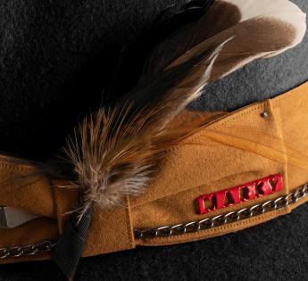 Die Kombination verschiedener Materialien und Texturen ist eine der angesagten Praktiken in dieser Saison. Überzeugen Sie sich selbst von dieser durchdachten Kombination aus Filz und Wildleder. Das Ergebnis ist ein klassischer Hut, der durch einen Galon in fröhlicher natürlicher Farbe ergänzt wird und erfolgreich mit Steppnähten, Fantasien und einer Feder verziert ist. So genießen wir eine Kreation, der eine schöne Note von Glanz hinzugefügt wurde.