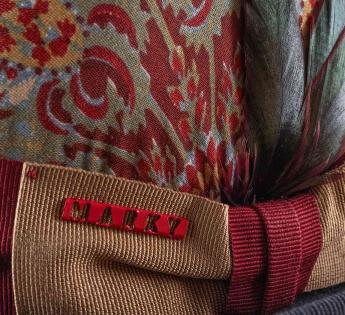 Ein herausragendes Stück in limitierter Auflage, dieser Bowler, der mit einem Vintage-Stoff im Paisley-Muster überzogen ist, zeichnet sich durch seine einzigartige Ausstrahlung aus. Jedes Exemplar weist eine unterschiedliche Musterplatzierung auf, was jeden Hut wirklich einzigartig macht. Eine sorgfältig gearbeitete Verzierung, verstärkt durch einen zweifarbigen Galon und eine Hahnenschwanzfeder mit grünen und bordeauxroten Schattierungen, zeichnet eine kühne und raffinierte Silhouette.