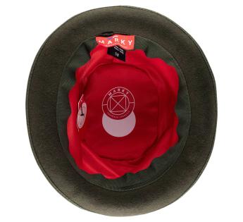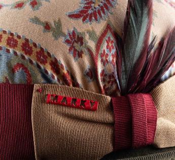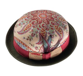 Ein herausragendes Stück in limitierter Auflage, dieser Bowler, der mit einem Vintage-Stoff im Paisley-Muster überzogen ist, zeichnet sich durch seine einzigartige Ausstrahlung aus. Jedes Exemplar weist eine unterschiedliche Musterplatzierung auf, was jeden Hut wirklich einzigartig macht. Eine sorgfältig gearbeitete Verzierung, verstärkt durch einen zweifarbigen Galon und eine Hahnenschwanzfeder mit grünen und bordeauxroten Schattierungen, zeichnet eine kühne und raffinierte Silhouette.