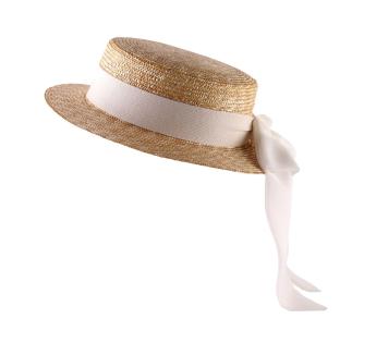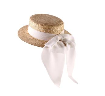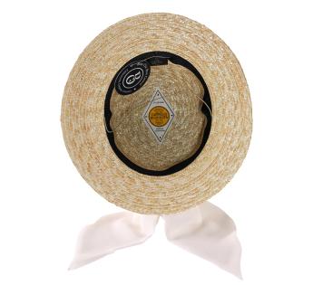Boater Kreissäge aus fein genähtem Stroh, hergestellt in Italien. Er ist mit einer handgefertigten Musselin-Schleife aus unserer Werkstatt in Frankreich verziert. Es handelt sich um ein Modell für kleine Mädchen, ganz in Eleganz.