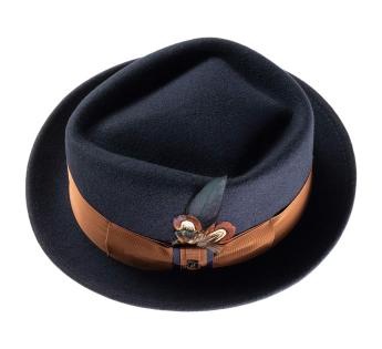 Der PorkPie Hut aus Filz verkörpert die zeitlose Eleganz eines Jazzclubs.