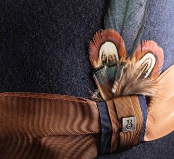 Seine kompakte und raffinierte Form wird durch eine satinierte Schleife, akzentuiert mit einer dezenten Feder, veredelt und evoziert eine zurückhaltende Raffinesse. Die Leichtigkeit des Filzes bietet unvergleichlichen Komfort, während das kunstvoll gearbeitete Band einen perfekten Sitz gewährleistet und Tradition mit Innovation verbindet.