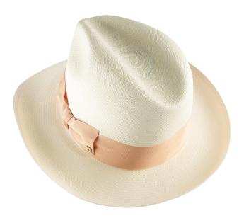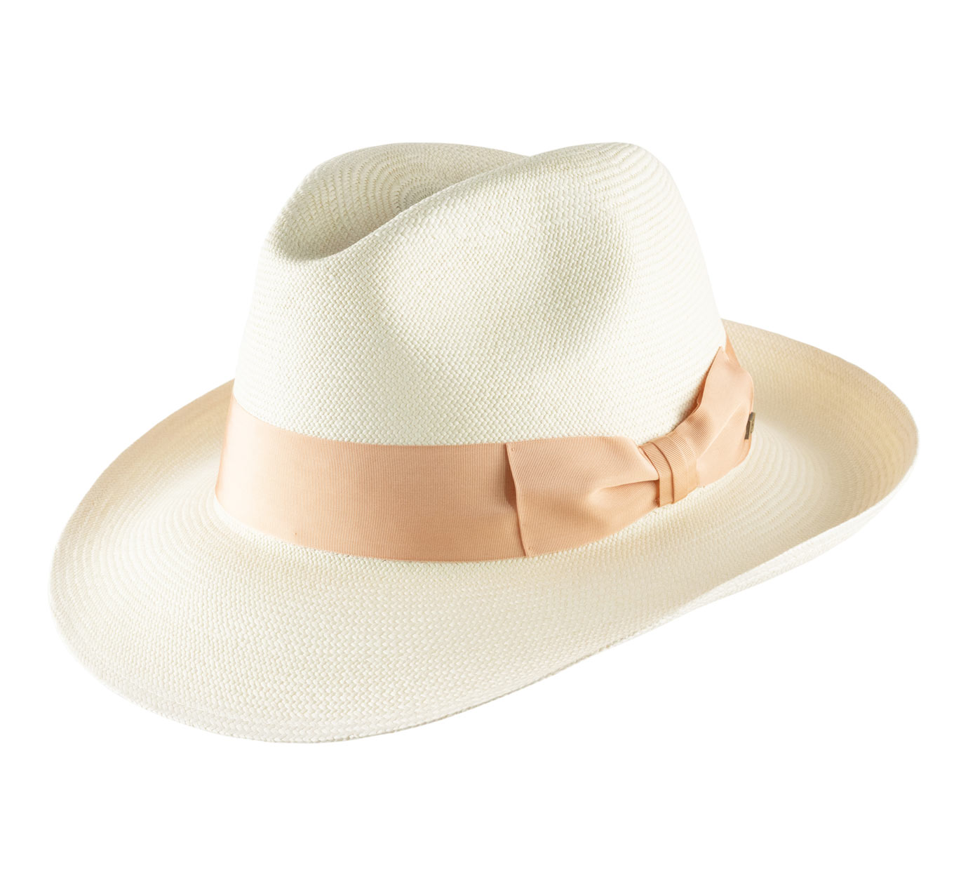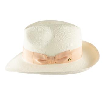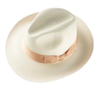 Der Panamahüte ist hier auf der Form des Fedora geformt, umgeben von einem Satinband aus Kunstseidenfaden aus Concorezzo, einer Region in Norditalien.