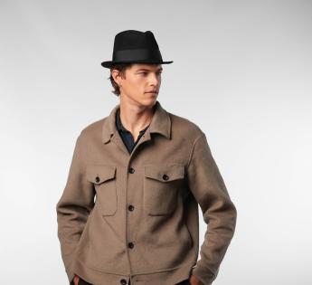 Mit seiner kurzen Krempe und leicht erhöhten Kopfhöhe lässt sich dieser Trilbyhüte gerne seitlich geneigt oder nach hinten gekippt tragen, um die Linie zu brechen. Der Grosgrain-Galon, der mit einem flachen Knoten endet, unterstreicht den eleganten Geist des Modells.