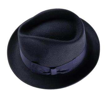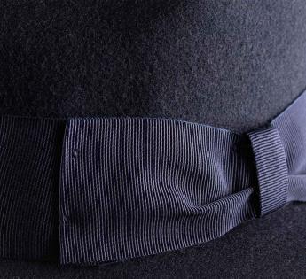 Mit seiner kurzen Krempe und leicht erhöhten Kopfhöhe lässt sich dieser Trilbyhüte gerne seitlich geneigt oder nach hinten gekippt tragen, um die Linie zu brechen. Der Grosgrain-Galon, der mit einem flachen Knoten endet, unterstreicht den eleganten Geist des Modells.
