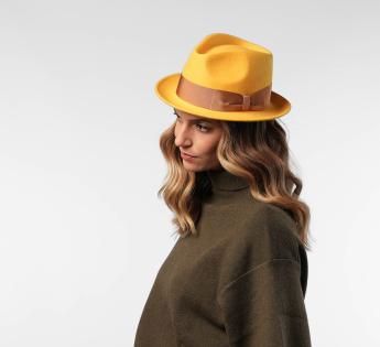 Mit seiner kurzen Krempe und leicht erhöhten Kopfhöhe lässt sich dieser Trilbyhüte gerne seitlich geneigt oder nach hinten gekippt tragen, um die Linie zu brechen. Der Grosgrain-Galon, der mit einem flachen Knoten endet, unterstreicht den eleganten Geist des Modells.
