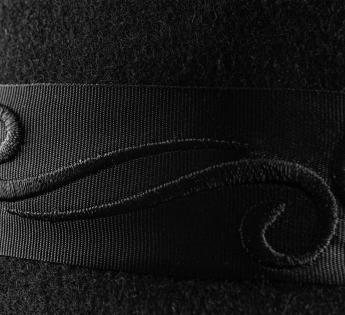 Seine Verzierung aus Grosgrain, verziert mit Ton-in-Ton Arabeskenstickerei, verleiht eine zusätzliche Note von Raffinesse. Das metallische Label an der Seite unterstreicht die Exklusivität des Modells. Innen sorgt ein Satinfutter für luxuriösen Komfort und erhält die makellose Form des Hutes. Dieser Fedora ist das Ergebnis sorgfältiger Arbeit, entworfen, um Eleganz und Langlebigkeit zu vereinen.