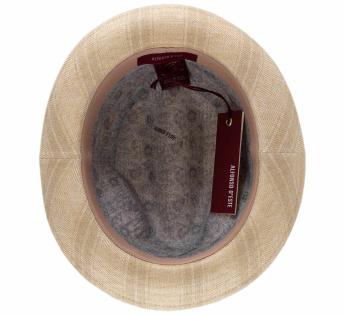 Dieser hut besticht sofort durch seine raffinierte Schlichtheit. Die klare Linie, der leuchtende Ton und das fast tonale Fischgrätmuster verleihen ihm eine subtile Struktur, voller Eleganz und Finesse.