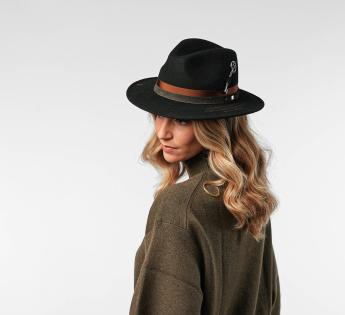 Das Ensemble wird durch einen doppelten, kontrastierenden Galon aus rohem Wildleder und Satinband hervorgehoben. Dieses Spiel der Texturen, zwischen Rauheit und Weichheit, betont die einzigartige Ausstrahlung dieses Hutes mit starkem Charakter.