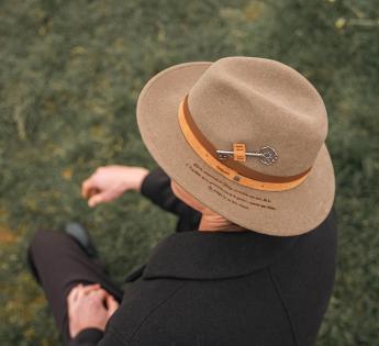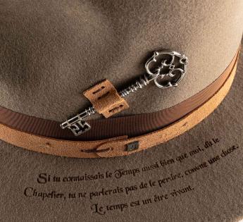 Vollständig aus dichtem und strukturiertem Wollfilz geformt, interpretiert dieses Modell die klassische Form der Travellerhüte durch eine symbolische Ästhetik, inspiriert vom poetischen Universum von Lewis Carroll, neu. Ein alter Schlüssel, anstelle der traditionellen Feder befestigt, wird zum Emblem des Geheimnisses der Zeit, ein direkter Hinweis auf den verrückten Hutmacher aus Alice.