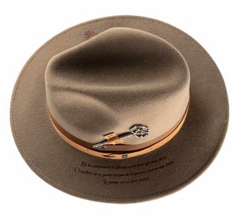Die Krempe ist mit einer Gravur verziert, die in unserer Werkstatt gefertigt wurde und einen Abschnitt, auf Französisch, aus Lewis Carrolls Roman "Hinter den Spiegeln" wiedergibt, während die Nähte und Stickereien kostbare Reparaturen evozieren, Zeugen der Zeit, die markiert, aber verschönert.