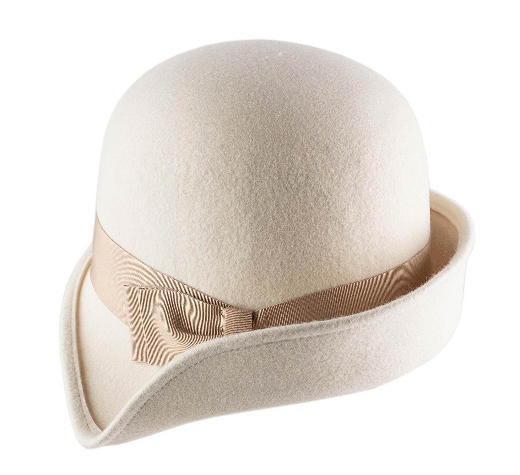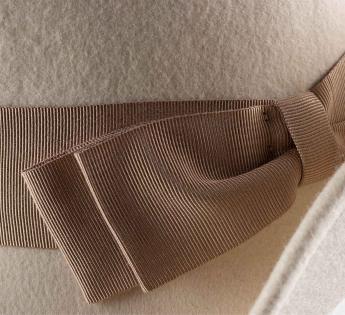 Mit seiner eleganten Silhouette und der hohen Kopfhöhe, verkörpert dieser Glockenhüte einen entschieden retro Stil. Seine Krempe erhoben an der Vorderseite verleiht der Linie Struktur und umrahmt sanft das Gesicht. Der ton-in-ton Galon aus Grosgrain, abgeschlossen mit einer flachen Schleife, betont seine Raffinesse ohne Überfluss.