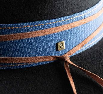Rock'n'roll Hut, personalisiert mit einem Jeansgürtel als Galon. Eine doppelte Runde aus Wildleder, abgeschlossen mit einer Schleife an der Seite, verleiht eine raffinierte Eleganz.