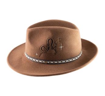 Hut in Fedora-Form, personalisiert mit Stickereien im Tattoo-Stil. Sie umhüllen die Kopfhöhe, die ebenfalls mit einem feinen Galon mit passenden geometrischen Mustern verziert ist.