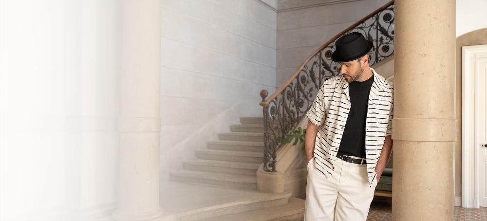 Oder ein schwarzes Sakko, ein offener Kragen, ein wissender Blick. Der Hut verbindet das Outfit mit der Haltung.