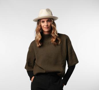 Die mittellange Krempe, vollständig hochgeschlagen, verleiht diesem Fedora Hüte eine weiche und sehr moderne Linie. Sein schlichtes Design gewinnt an Charakter durch eine natürliche Feder, die dezent in den Grosgrain-Galon gesteckt ist.
