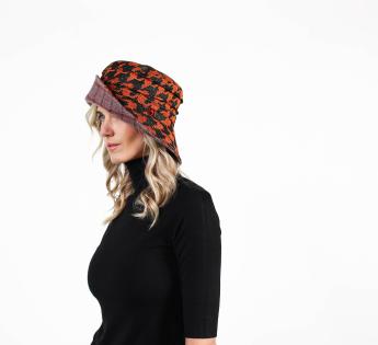 Originalmodell eines Huts mit abfallendem Rand, personalisiert mit einem zeitlosen Stoff im Hahnentrittmuster. Der Stoff enthält auch Lurex-Garn, was diesem femininen Hut einen festlichen und glänzenden Charakter verleiht. Darüber hinaus sorgt die textile Mischung für Wärme und Komfort für ein angenehmes Trageerlebnis. Der modulare Rand ermöglicht zudem eine erweiterte Schutzfunktion.