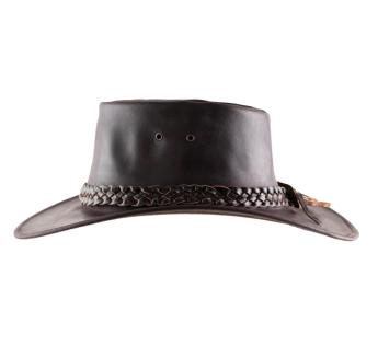 Australischer Hut aus glattem Leder, verziert mit einem Flechtwerk aus Leder mit 4 dicken Strängen. Das Material ist tatsächlich Rindsleder, hergestellt aus der besten Auswahl an Leder. Diese Wahl verleiht dem Modell Komfort und Robustheit für angenehme und langanhaltende Erfahrungen.