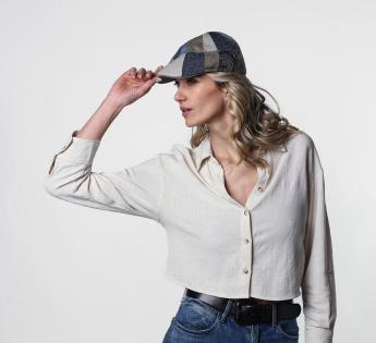 Casquette bec de canard in einem harmonischen Patchwork aus Materialien. Das Design ermöglicht ein reichhaltiges Ensemble aus Details und Nuancen. Es ist ideal für diejenigen, die einen einzigartigen Stil suchen und die Qualität des Handwerks hervorheben.