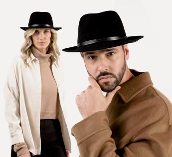 Hut aus hochwertigem Filz, von Natur aus wasserabweisend. Seine Kopfhöhe in Tropfenform ist von einer Verzierung aus Leder mit geometrischen Mustern umgeben. Ein raffiniertes Design, in einer idealen Farbe für die Wintersaison.